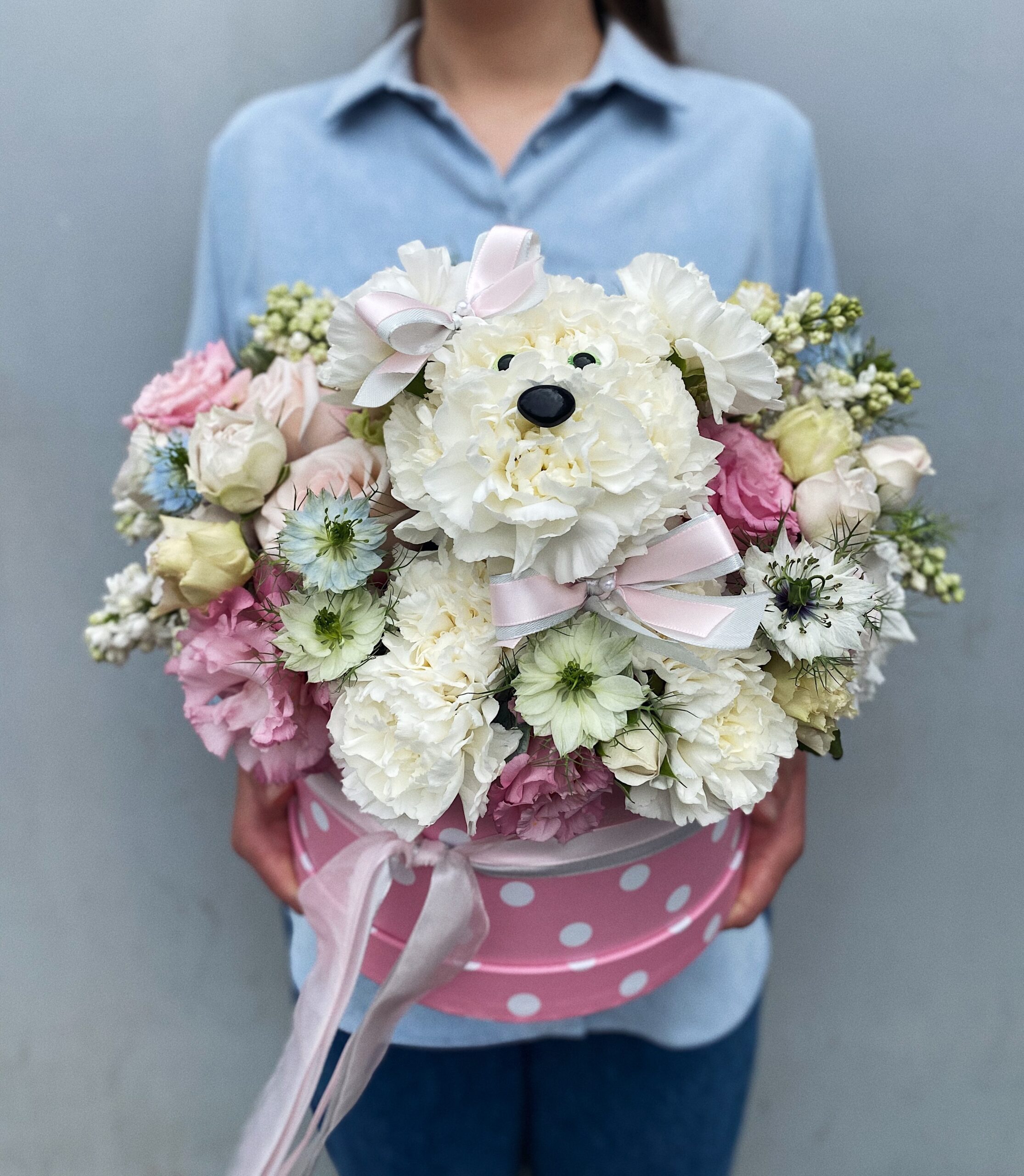 Игрушка Собачка из белой гвоздики с атласным бантом в цветочной шляпной коробке. Состав и цветовая гамма может быть разной – в основном это сезонные цветы и зелень.