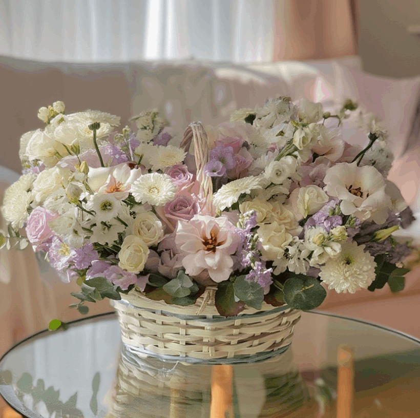 Состав корзины : Мини гербера , маттиола белая и розовая, роза Ангелина, роза лаванда Баблс, эустома, дельфиниум белый, гортензия и эвкалипт.