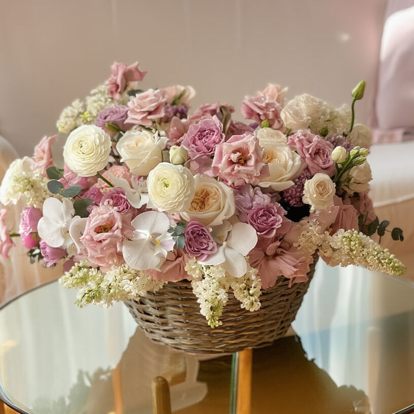 Состав композиции : ранункулюсы белые, эустома розовая, орхидея, пионовидная роза Охара, кустовая роза, белая сирень.