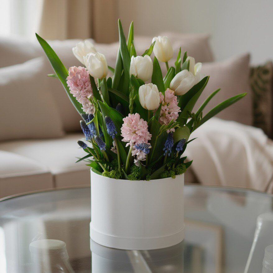 Все букеты Флористической студии Fler доставляются получателю в Аква-боксе с водой в специальном растворе, которых сохраняет свежесть цветов.