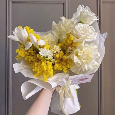 Весенний букет – белые ирисы, белые розы,мимоза, гиацинт.