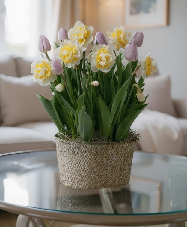 Композиция из срезанных тюльпанов и гиацинтов в плетеном кашпо.