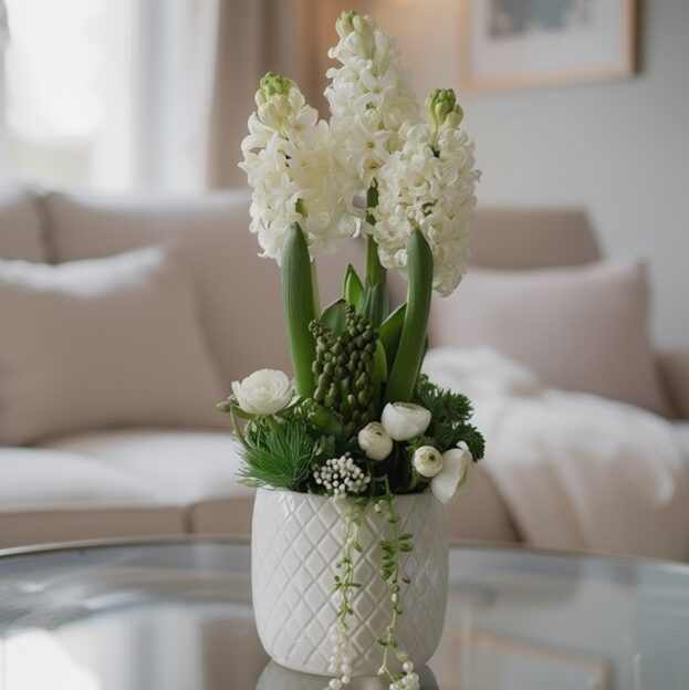 Весенняя композиция в кашпо белые гиацинты, маттиола, эустома, зелень.