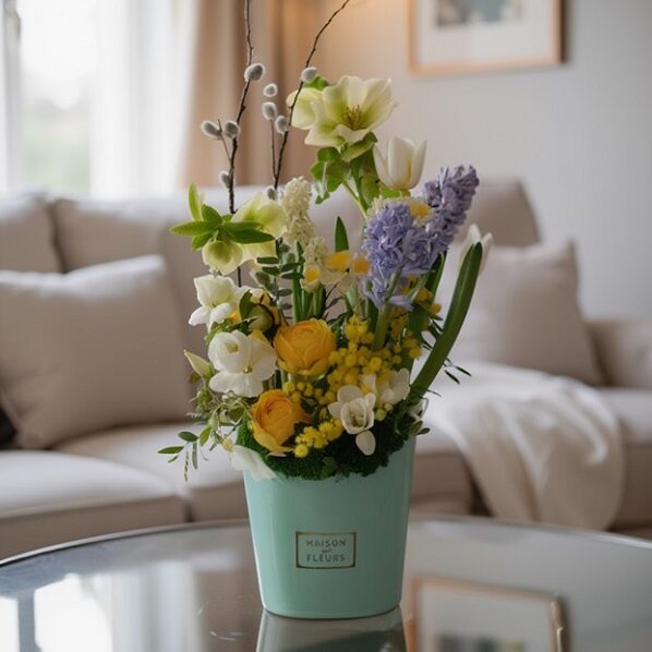 Весенняя композиция из гиацинтов, тюльпанов, морозника, вербы и мимозы в кашпо.