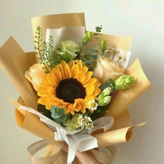 Сборный букет с подсолнухом, розами, эустомой и эвкалиптом.