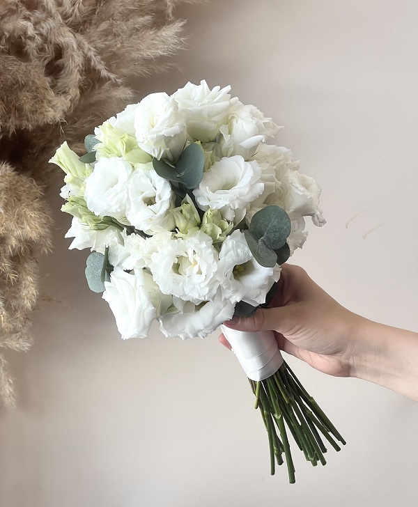 Букет невесты из белой махровой эустомы и веточек эвкалипта.