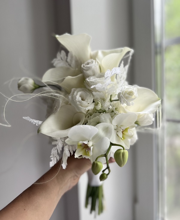 Букет невесты из белых калл, веточек орхидеи, веточки маттиолы, эустома, ковыля.