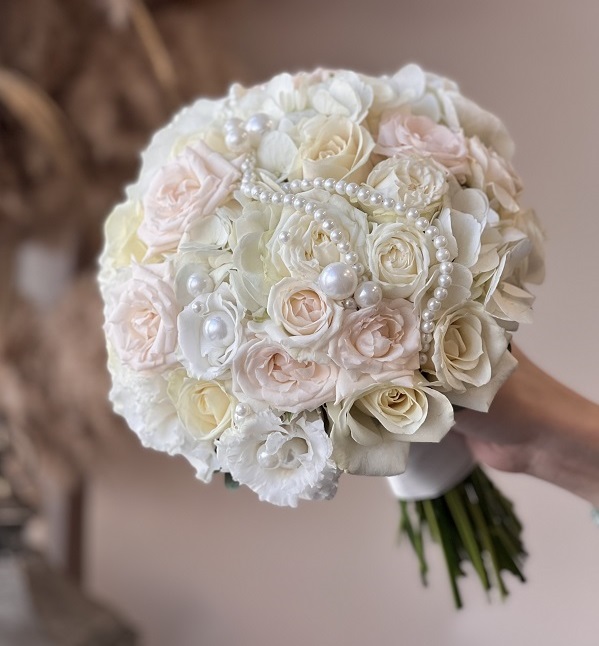 Букет невесты из пионовижных кустовых роз Бамбастик, белых роз,белой эустомы, белой гортензии, веточки эвкалипта.Букет оформлен жемчужными бусами.